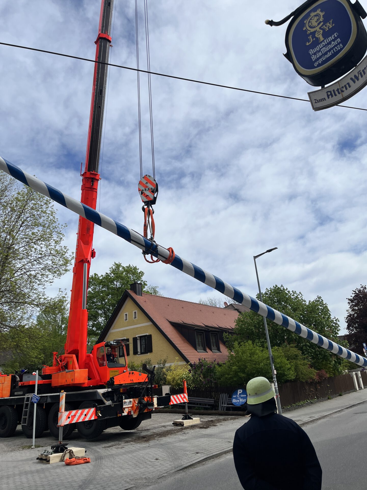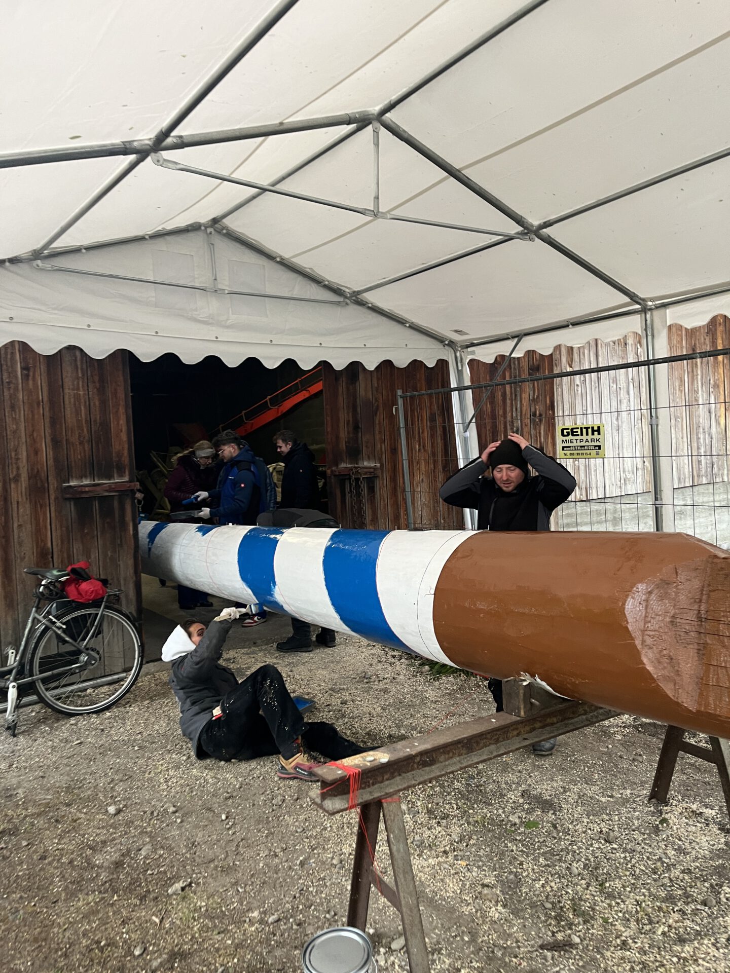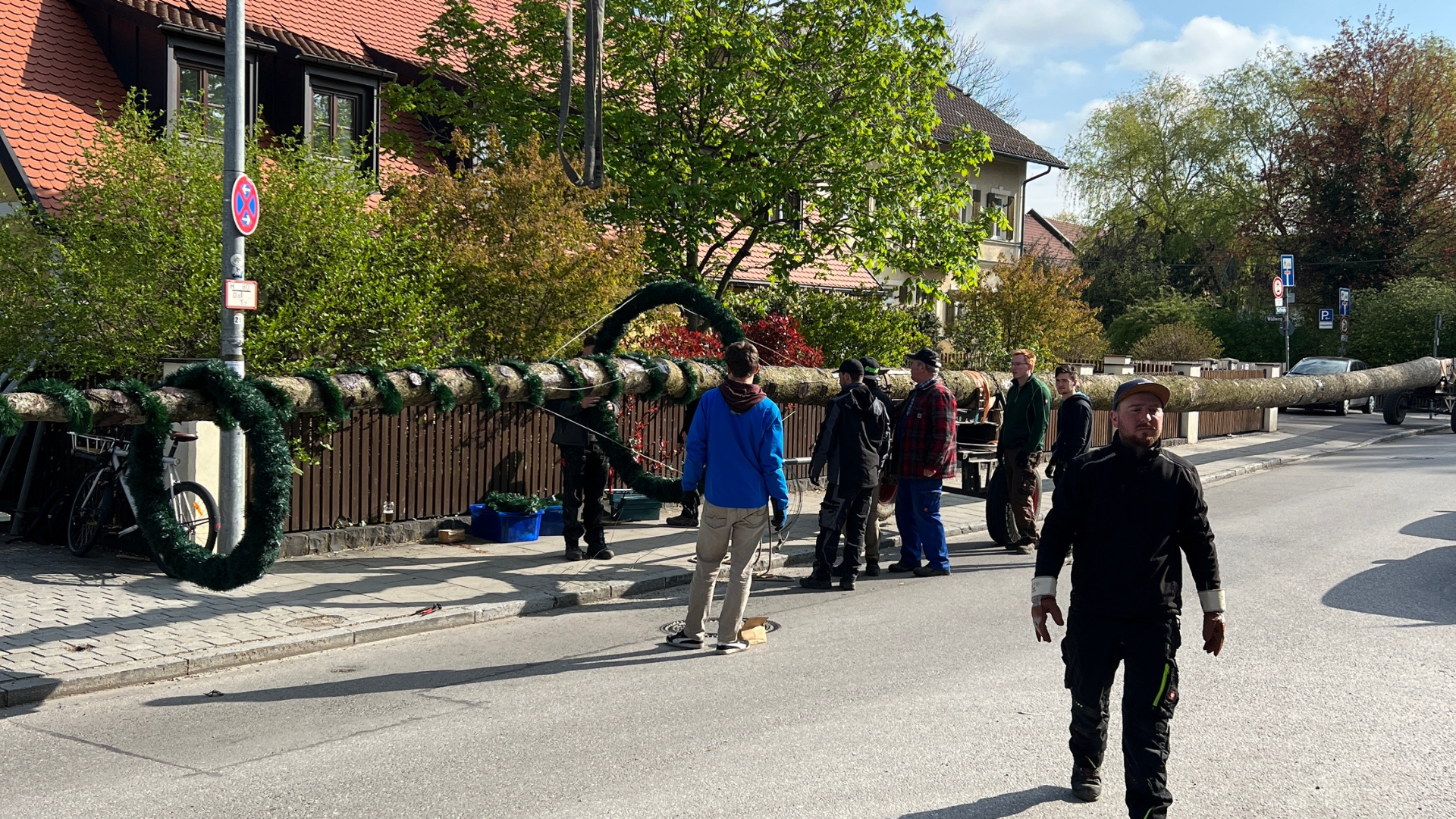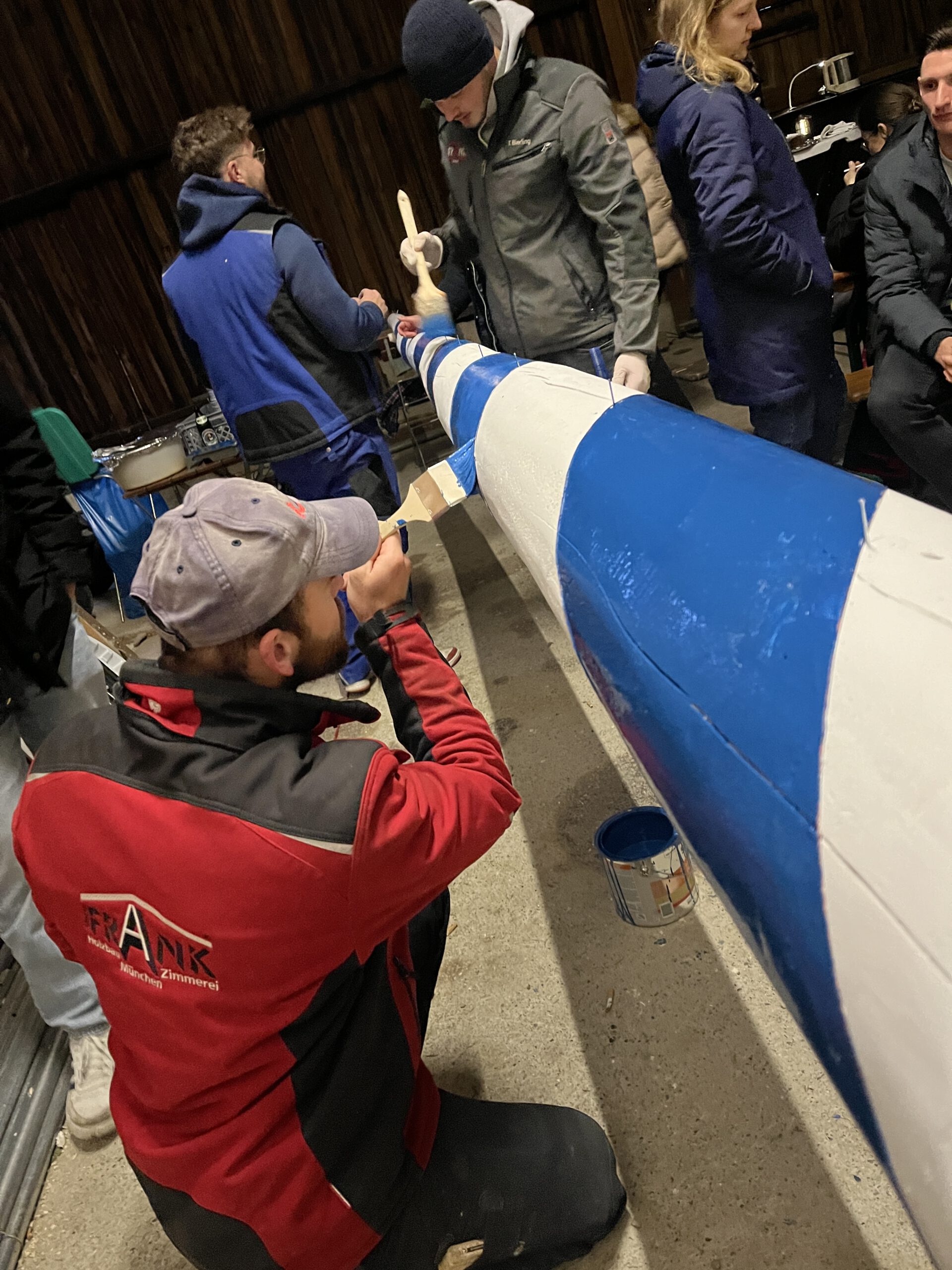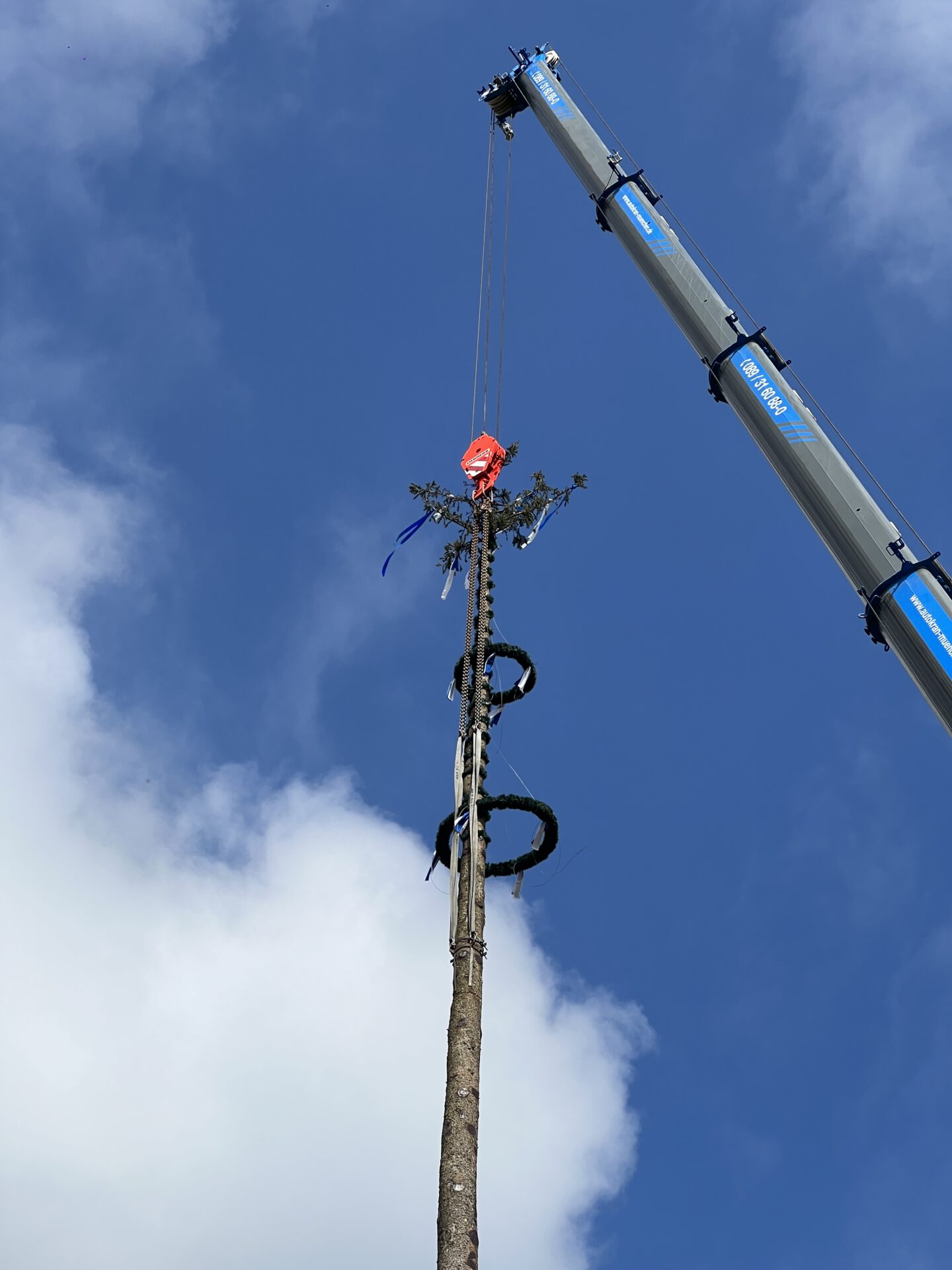 Im zweiten Jahr wird der Baum umgelegt und g’scheppst, also entrindet, geschliffen und grundiert. Dann kommt der schönste Teil: weiß-blau ringeln, so wie’s sich für einen richtigen Maibaum gehört. Zwei Wochen lang wird der Baum rund um die Uhr bewacht – auch nachts, denn ein unbewachter Maibaum ist ein gestohlener Maibaum. Zum Schluss stellen wir den Maibaum mit dem Kran an der Dorfstraße gegenüber dem Alten Wirt von Obermenzing auf.