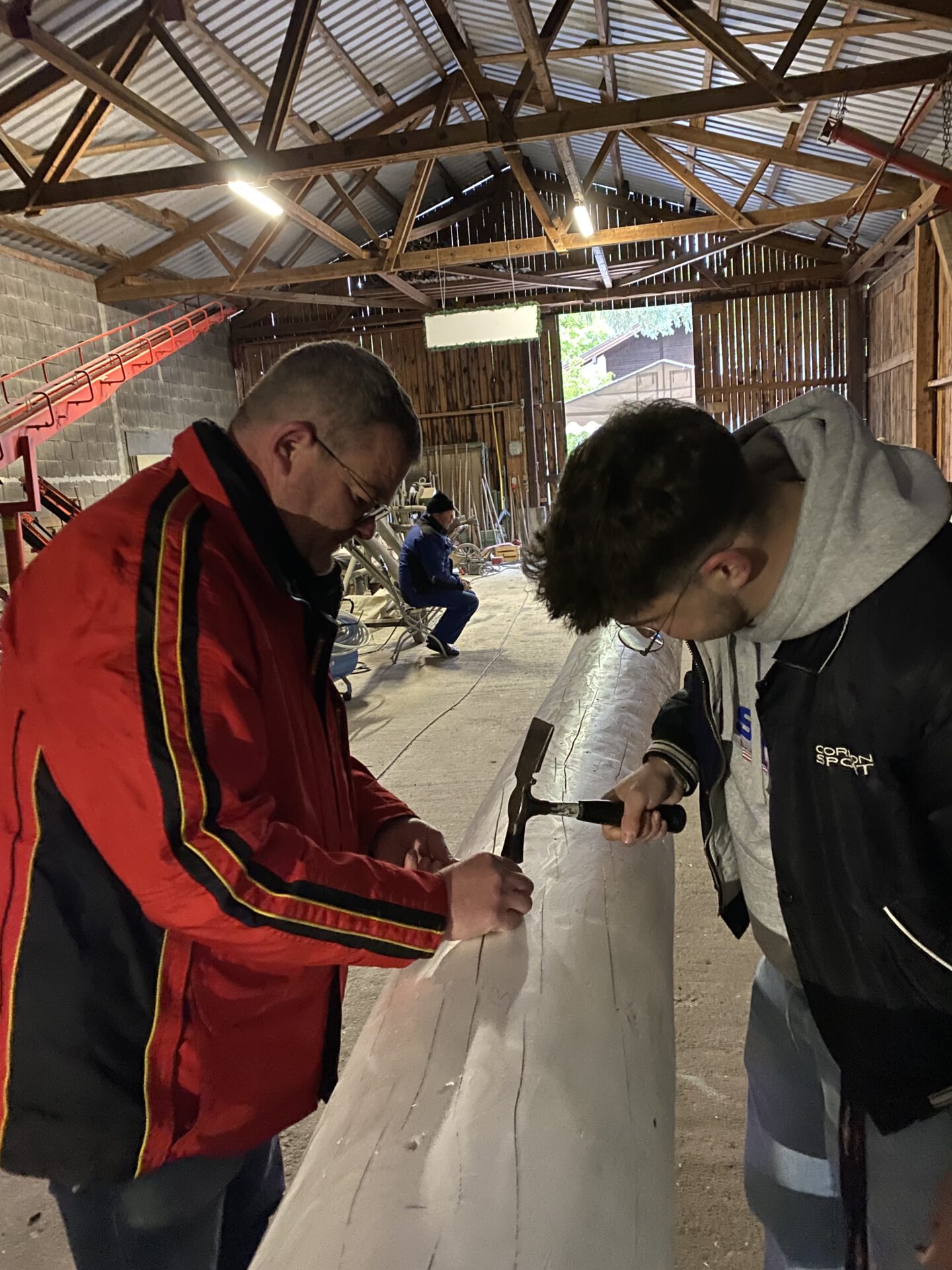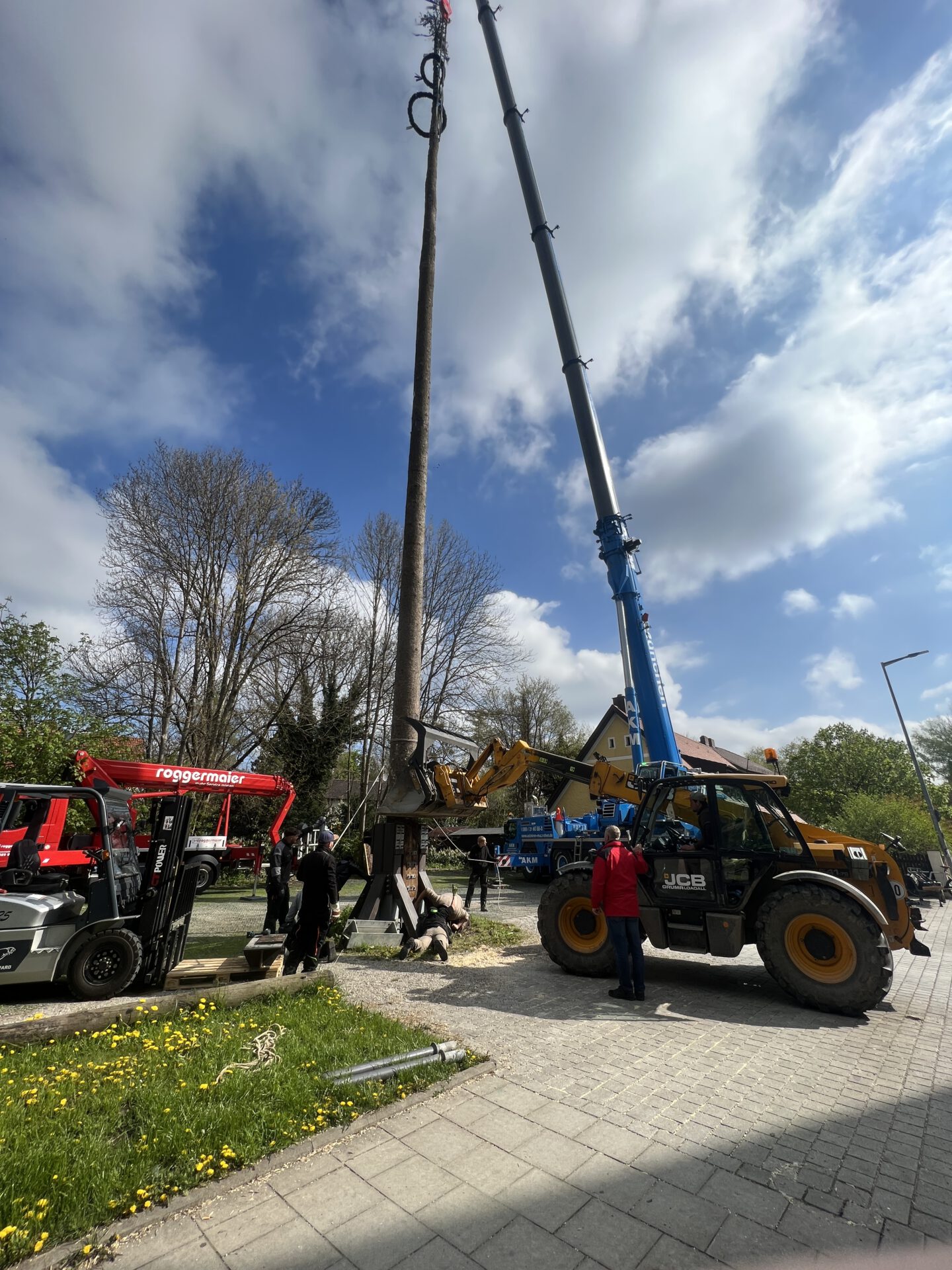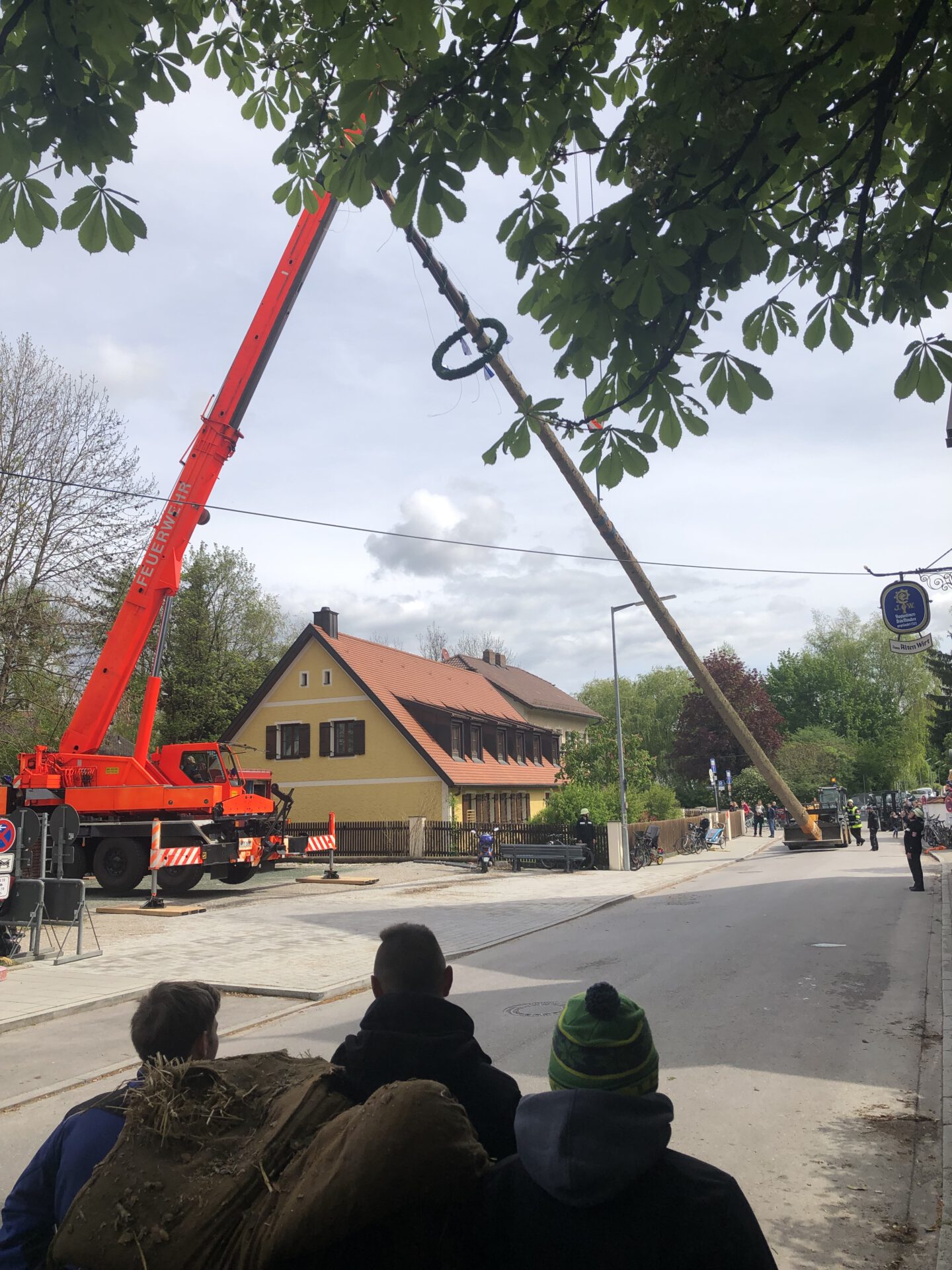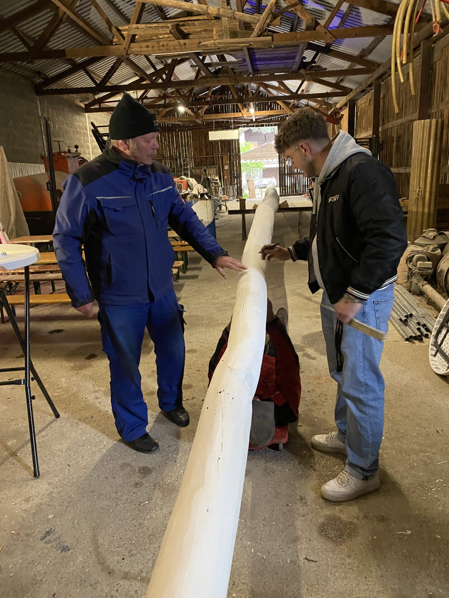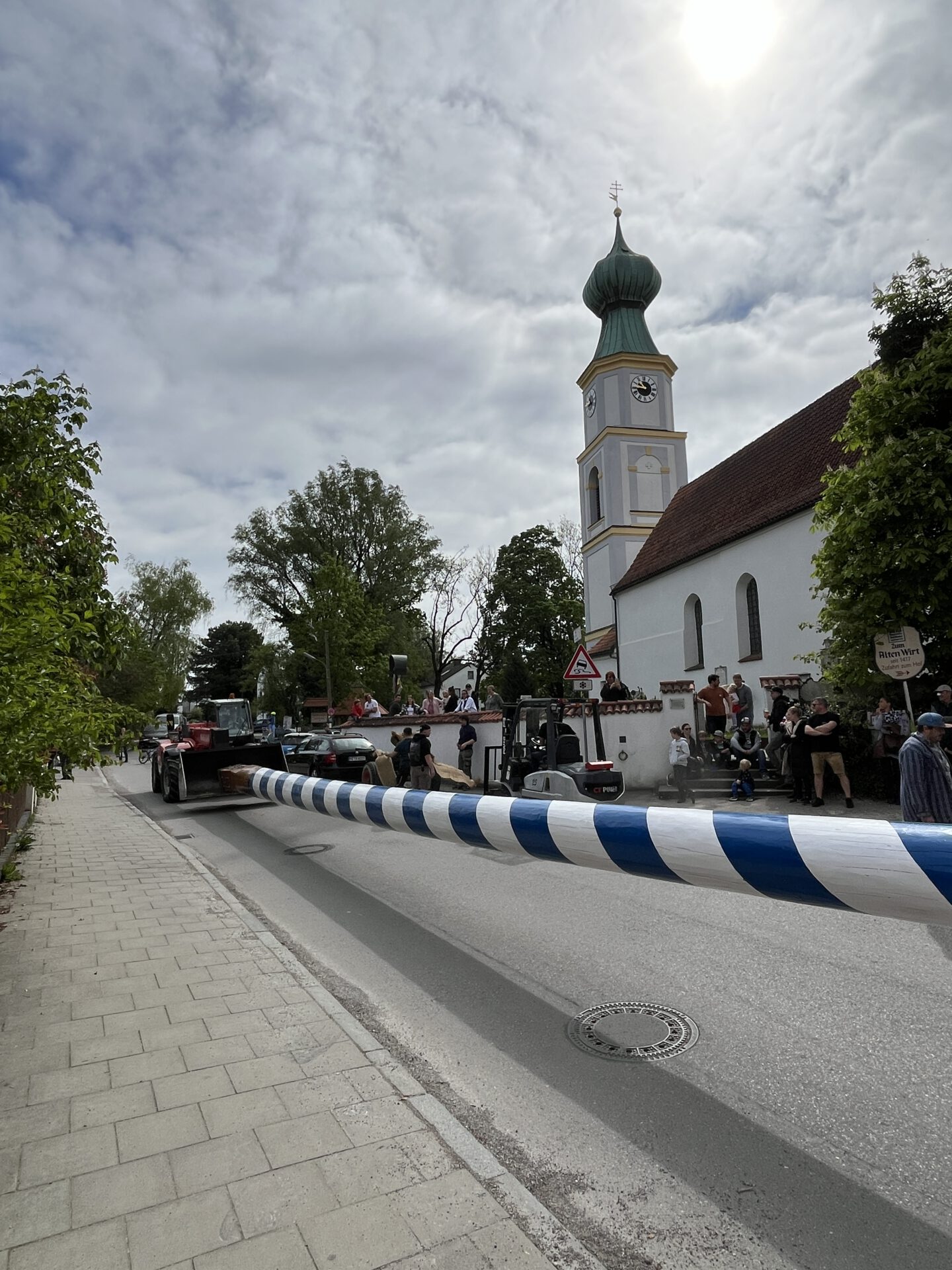 Im zweiten Jahr wird der Baum umgelegt und g’scheppst, also entrindet, geschliffen und grundiert. Dann kommt der schönste Teil: weiß-blau ringeln, so wie’s sich für einen richtigen Maibaum gehört. Zwei Wochen lang wird der Baum rund um die Uhr bewacht – auch nachts, denn ein unbewachter Maibaum ist ein gestohlener Maibaum. Zum Schluss stellen wir den Maibaum mit dem Kran an der Dorfstraße gegenüber dem Alten Wirt von Obermenzing auf.