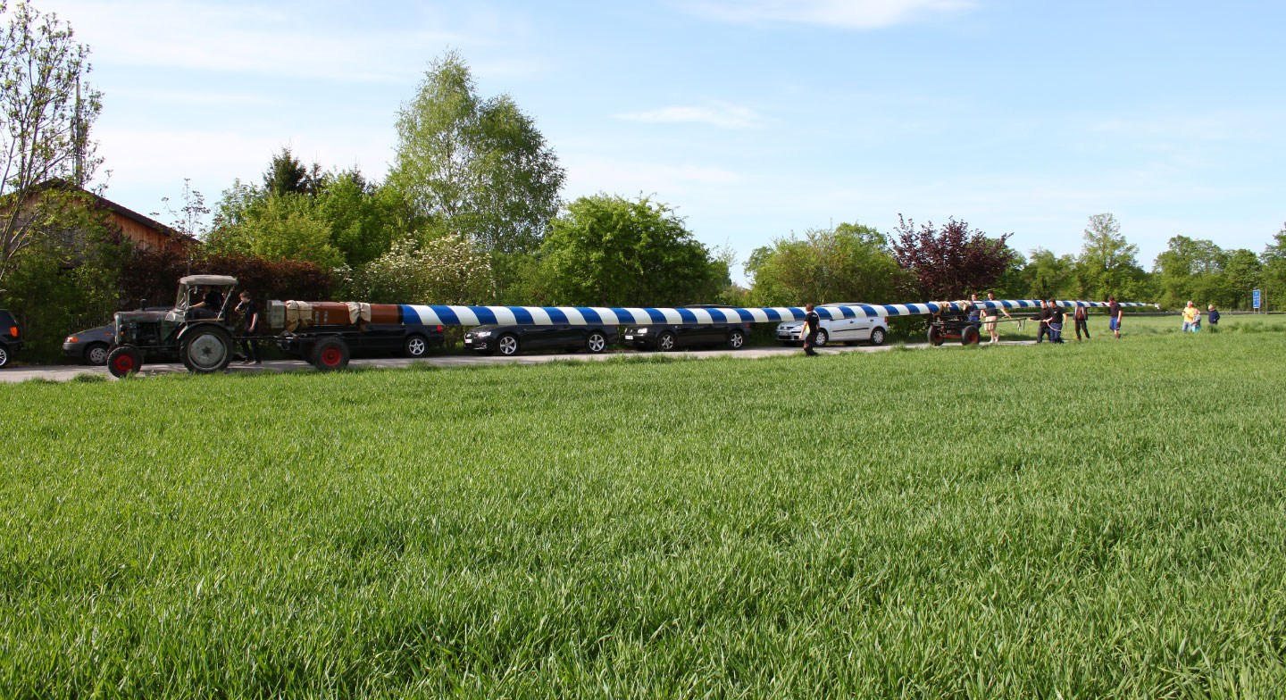 Ein schöner, gerader Maibaum ist schwerer zu finden als man denkt. Alle drei Jahre geht’s in die Wälder rund um München – wo genau, entscheidet der Baumbestand. Wenn der richtige Stamm gefunden ist, wird er gefällt, entastet und mit Maibaumwagerl und Traktor nach Obermenzing transportiert. Im ersten Jahr steht er noch mit Rinde – mir Rinde, naturbelassen und trotzdem schon was Besonderes.